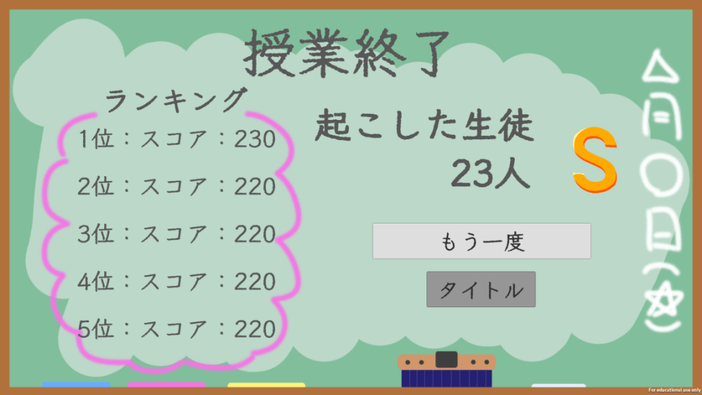 - 寝ている生徒にチョークを当て起こすことでスコアを加算し、ハイスコアを狙っていくゲーム